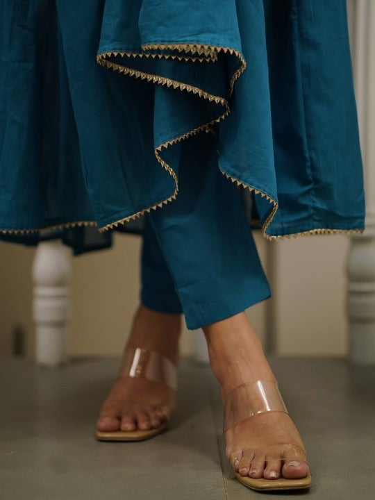 Floral Yoke Design Thread Work Pure Cotton Anarkali Kurta With Trousers & Dupatta